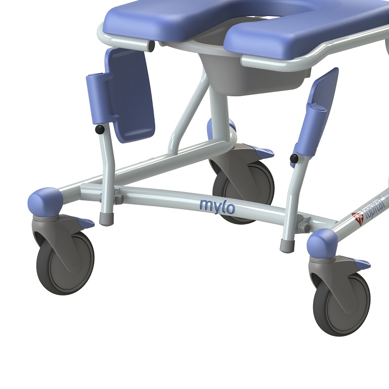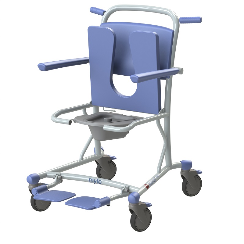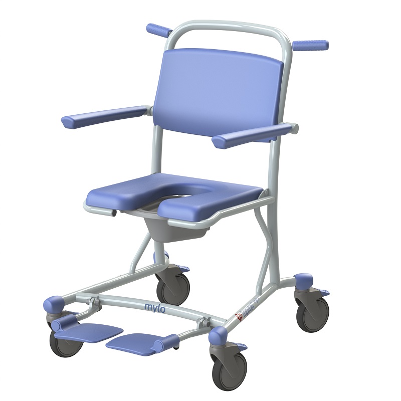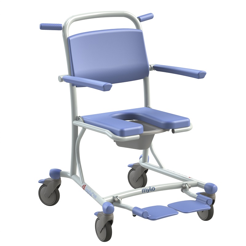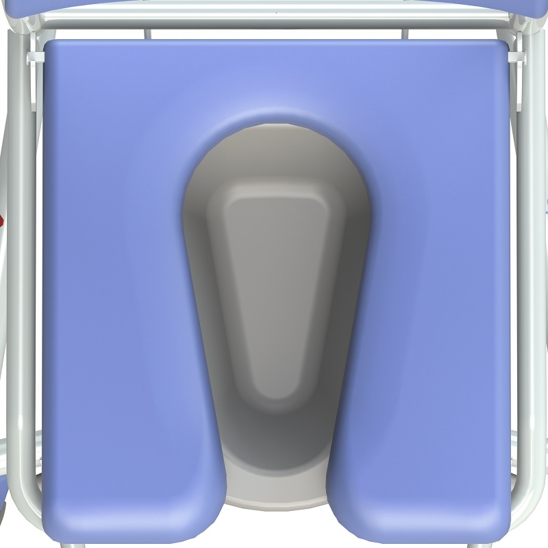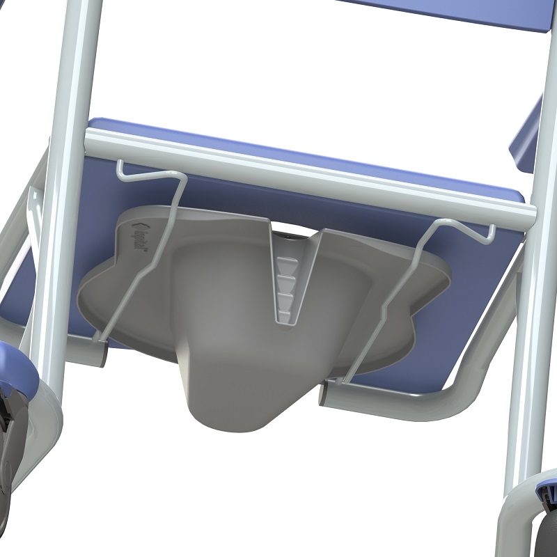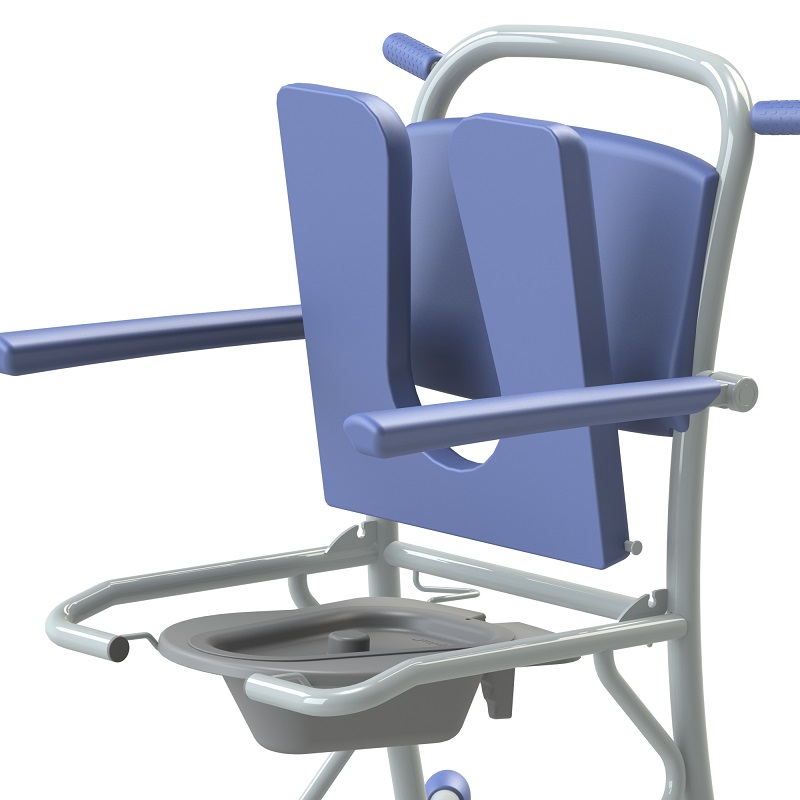 Just for cure and care. Maximum load: 150 kg. Folding and detachable seat for optimal hygiene. Rail for bucket or bedpan.
